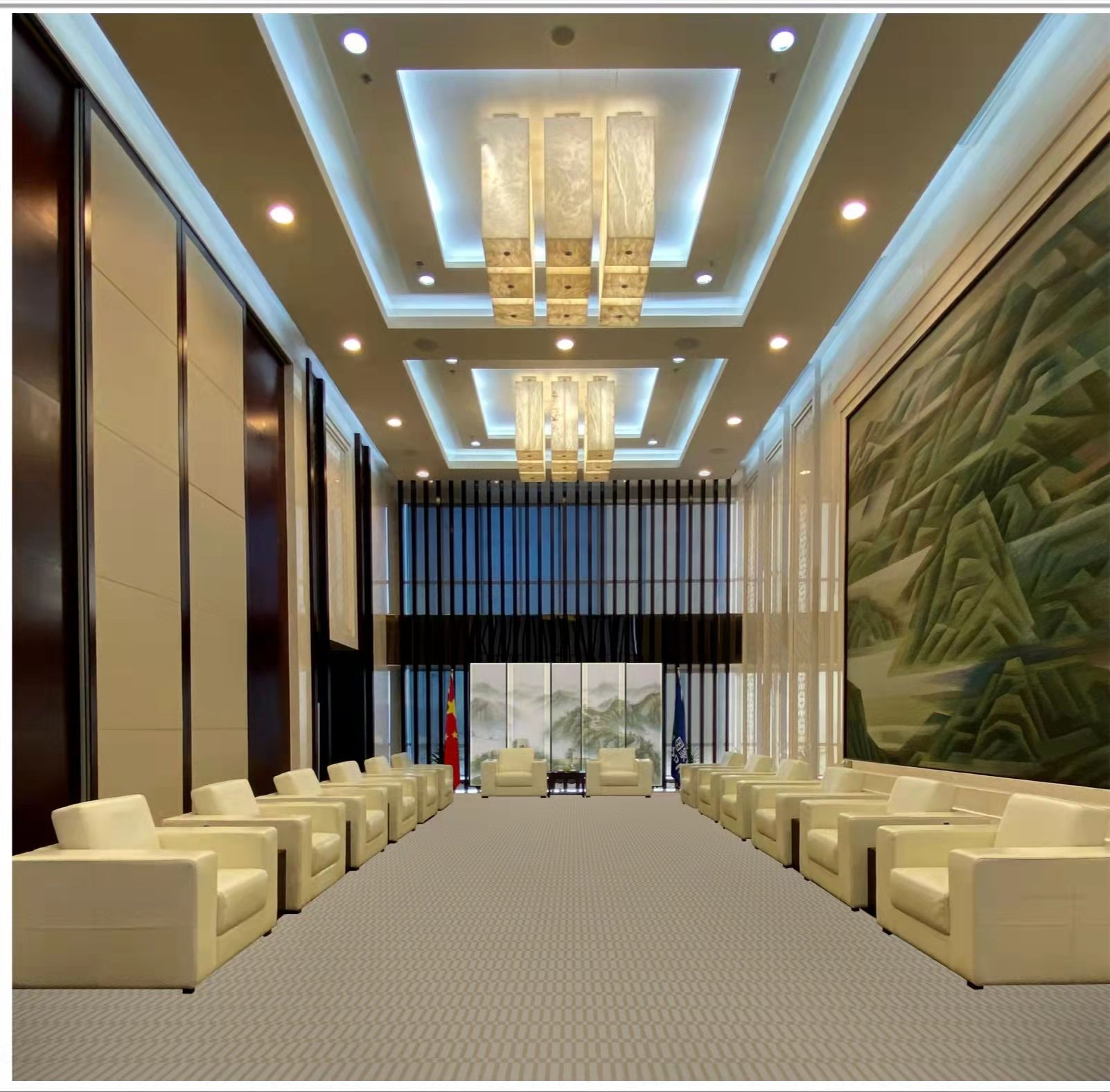 貴賓接待室地毯是接待領導和貴賓的地毯,裝飾一般以新中式和簡歐風格居多,貴賓室格調是大氣、高貴、典雅、嚴肅而不失活躍,具有一定的地域文化品味。