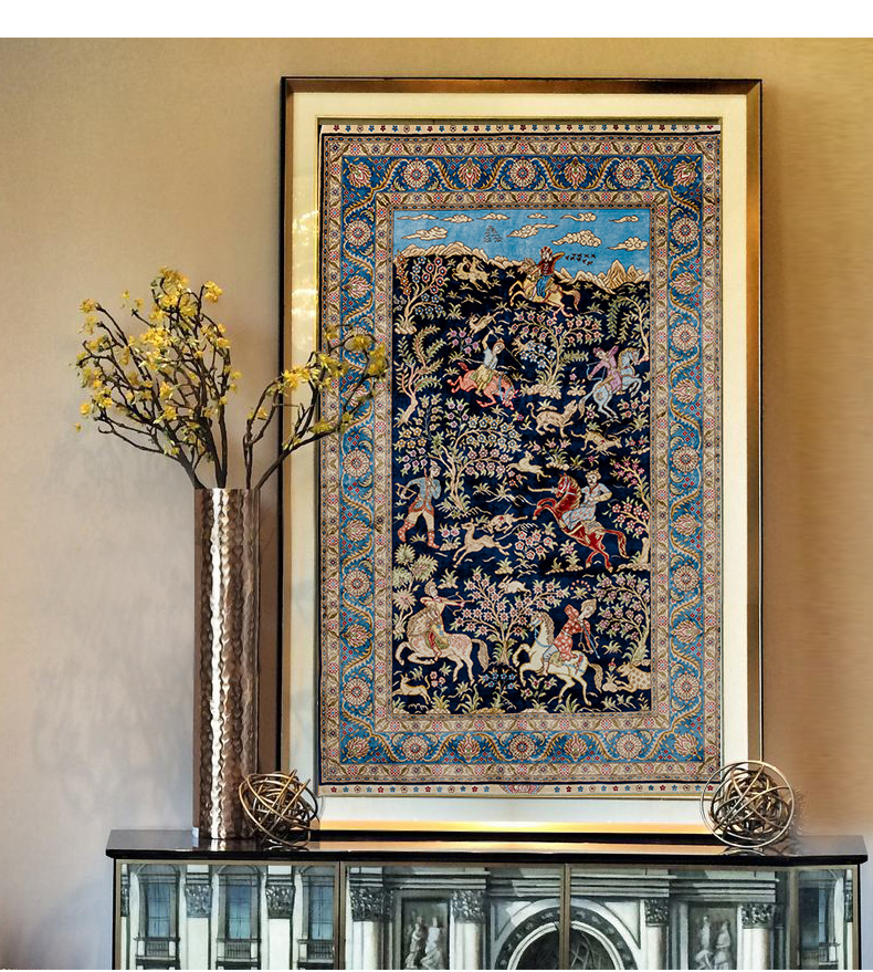 真絲指蠶絲,也是地毯的傳統材料之一,使用歷史非常悠久,我國唐代詩人白居易曾有"一丈毯,千兩絲"的詩句。 真絲地毯指的就是絲毯,即以桑蠶絲線、柞蠶絲線栽絨綰結而編織成的手工栽絨地毯。真絲地毯花紋精致細膩,質感很強,深受各界人士喜愛。其圖案靈活多變,多采用中國的傳統紋飾,花紋精 致,有良好寓意。 絲毯的生產工藝與羊毛地毯大致相同,僅是原料準備和后處理不同。蠶絲先要經過煉絲,即將生絲浸在堿溶液中,去除絲纖維外表的膠質,成為熟絲。一般將27根熟絲捻成一股絲線,經過酸性染料染色,成為栽絨原料。絲毯的中檔產品采